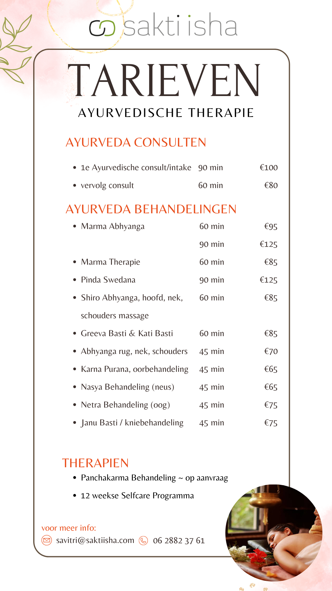 Per 1 januari 2025 gelden de tarieven hieronder. Ayurvedische behandelingen kunnen afhankelijk van uw zorgverzekering gedeeltelijk in aanmerking komen voor vergoeding. U krijgt een factuur mee die u bij uw verzekeraar kunt declareren. Voor de behandel tarieven zie hieronder en in de link onze prijslijst.